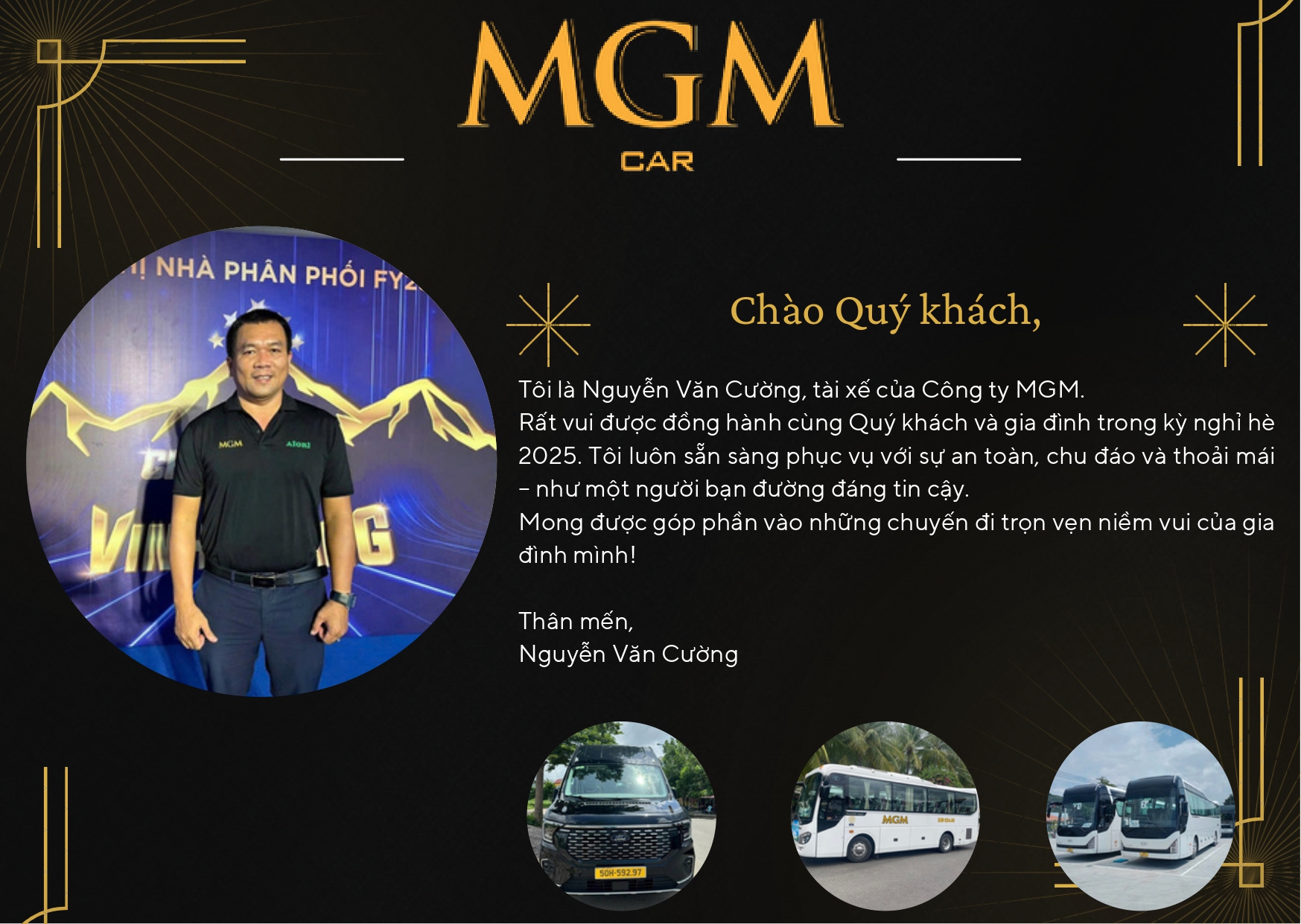 Với MGMcar, mỗi chuyến đi là một hành trình gắn kết — và mỗi khách hàng là một người thân yêu thương mến. Chúng tôi không chỉ chở bạn đi, chúng tôi đồng hành cùng bạn, cùng chia sẻ niềm vui, sự an toàn và sự tử tế trên mọi nẻo đường.